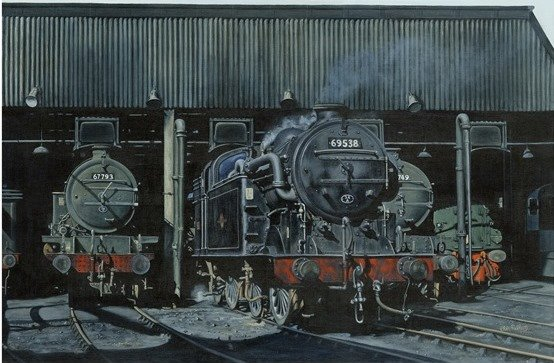 Condenser fitted N2 0-6-2T 69538 is flanked by L1 2-6-4T's 67793 and 67749 outside the 'Met' shed at Kings Cross, note the English Electric Type 4 (TOPS Class 40) and BTH Type 1 (TOPS Class 15) diesels lurking in the shadows on the right.